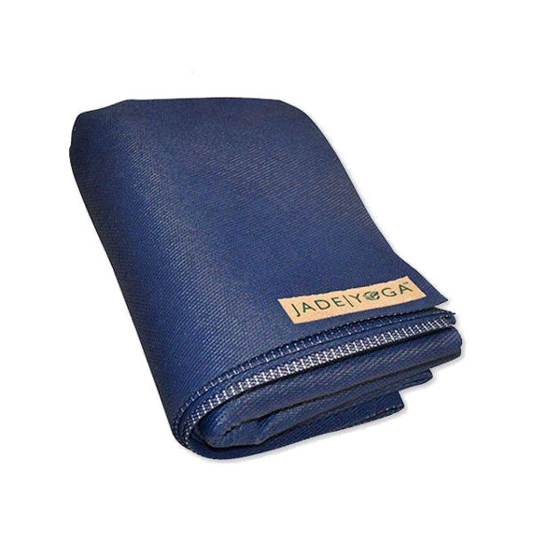 Коврик для йоги Jade Voyager midnight blue - надзвичайно тонкий та легкий килимок для йоги, який складається приблизно до розміру блоку для йоги, та легко поміщається у валізу або рюкзак. Килимок виготовлений з натурального каучуку і не містять ПВХ або інших синтетичних каучуків. Він чудово підходить для йогів у дорозі, а також для тих, хто любить тісніше контактувати з землею.