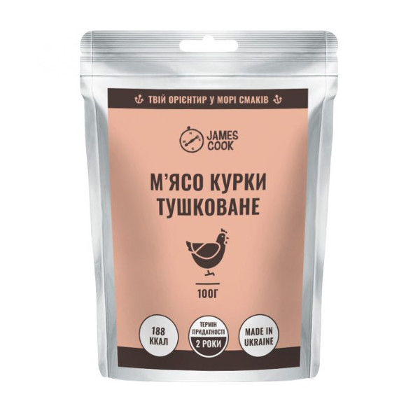 М’ясо курки тушковане від James Cook – страва, готова до вживання (англ. meal, ready-to-eat). Виготовлена способом тушкування у автоклаві. Інноваційна термостійка упаковка дозволяє зберігати готову страву до 2 років.