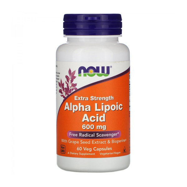 NOW Foods Alpha Lipoic Acid 600 mg - це добавка на основі альфа-ліпоєвої кислоти з додаванням екстракту виноградних кісточок та екстракту плодів чорного перцю. Альфа-ліпоєва кислота (АЛК) природним чином виробляється в організмі людини в дуже невеликих кількостях, але також присутня в деяких продуктах харчування. АЛК унікальна тим, що вона сприяє роботі систем поглинання вільних радикалів організму і може діяти як у водному, так і в жировому середовищі. АЛК може переробляти вітаміни C і E, тим самим підвищуючи їх антиоксидантні властивості.