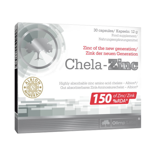 Olimp Chela-Zinc - це джерело цинку, необхідного для нормального функціонування м’язів та репродуктивної системи. Дефіцит цієї речовини часто виникає під час інтенсивних тренувань. Окрім впливу на репродуктивну систему чоловіків та рівень тестостерону, цинк впливає на сотні обмінних процесів.