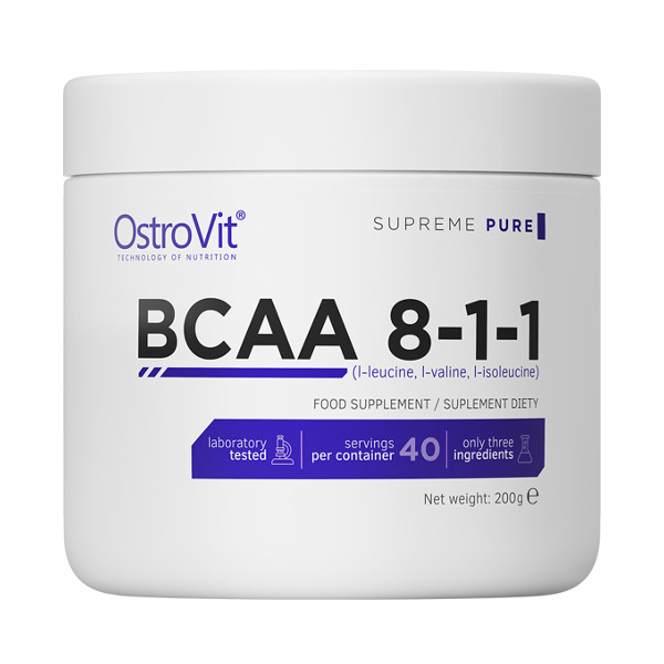 OstroVit BCAA 8-1-1 - це амінокислоти з розгалуженим ланцюгом BCAA з унікальним співвідношенням 8:1:1 L-лейцину до L-ізолейцину і L-валіну. BCAA (Branched-chain amino acid - Амінокислоти з розгалуженими бічними ланцюгами) відносяться до групи екзогенних (незамінних) амінокислот, які необхідні в нашому раціоні, оскільки наш організм не може виробляти їх самостійно. Вони є невід'ємним елементом синтезу більшості білків, і більше 30% наших м'язів складаються з ВСАА. Їх застосування підвищує витривалість і силу на тренуваннях, а також зменшує хворобливі відчуття після тренувань. Такі амінокислоти знижують активність катаболізму і беруть участь в енергетичному обміні.