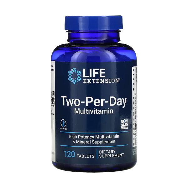 Life Extension Two-Per-Day – мультивитамины, обеспечивающие полный спектр основных витаминов, минералов и других питательных веществ, в форме таблеток с приемом два раза в день, которые соответствуют или превышают рекомендованную диетическую норму (RDA) почти для каждого ингредиента.