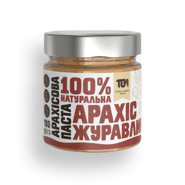 TOM Арахисовая паста с клюквой - вкусная арахисовая паста с кислинкой. Очень интересное сочетание легкой горчинки прожаренного арахиса и кисловато-сладкой клюквы. Сушеная клюква сохраняет все свои полезные свойства, поэтому является очень ценным сухофруктом и делает арахисовую пасту еще более полезной. Это сбалансированный продукт, содержащий полезные растительные жиры, богатый протеином, углеводами и клетчаткой. Хорошо подходит для спортсменов, активных людей и всех ценящих здоровое питание.