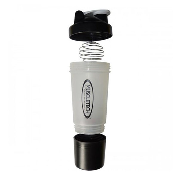 Шейкер Muscletech з пружинкою та контейнером - шейкер для приготування та вживання білкових та білково-вуглеводних коктейлів. Кришка горловини - зручна у відкриванні кліпса. Шейкер виготовлений з високоякісного пластика. Спеціальна сталева кулька, що входить до комплекту, допомагає ретельно розбити грудочки, щоб отримати ідеально розчинену і «гладку» консистенцію.