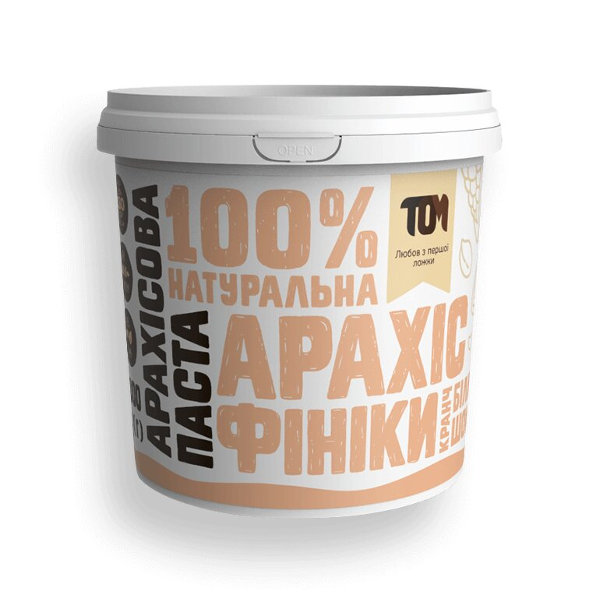 ТОМ Арахісова паста кранч з білим шоколадом та фініками - арахісова паста, яка виготовлена з високоякісного арахісу і є природним джерелом білка, вуглеводів і жирів. Моно- та поліненасичені жири в складі арахісової пасти роблять її чудовим продуктом для спортсменів, які піклуються про підтримку здорового та збалансованого харчування для серця. Заміна насичених жирів ненасиченими в раціоні сприяє підтримці нормального рівня холестерину в крові. Зменшення споживання натрію сприяє підтримці нормального артеріального тиску.